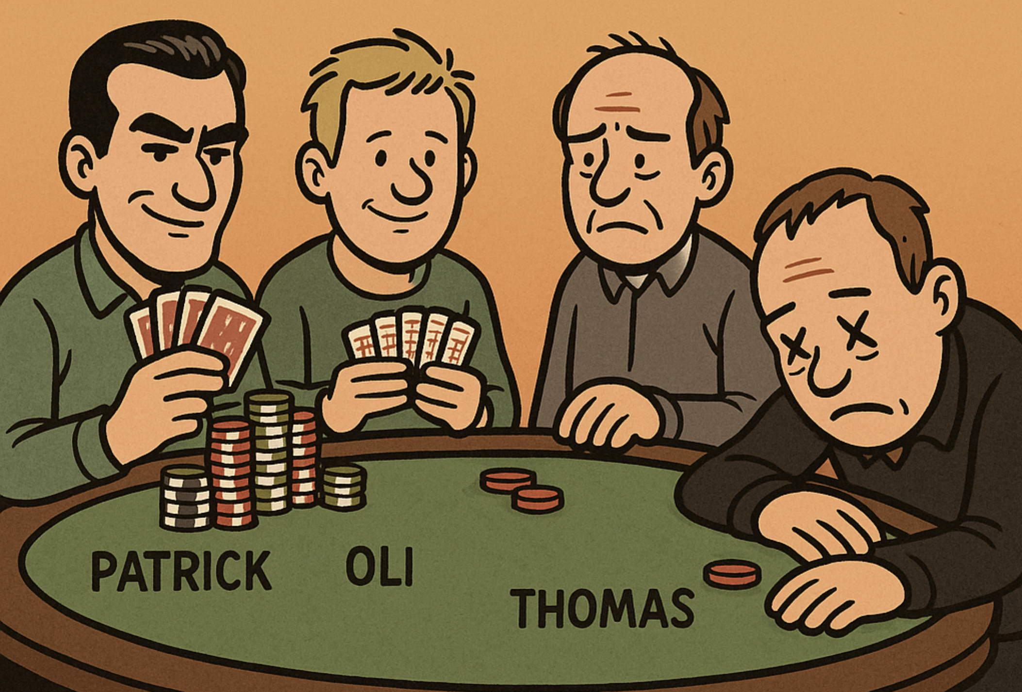 Die ersten Hände verliefen unspektakulär, wenn man davon absieht, dass Tony bereits nach zehn Minuten so wirkte, als hätte er sich aus Versehen an einen Pokertisch gesetzt, obwohl er eigentlich zum Flohmarkt wollte. Patrick dagegen verteilte Chips in seine eigenen Stapel wie ein Steuerprüfer mit leicht sadistischer Ader. Oli, vom Schicksal der letzten Runde offenbar genug gedemütigt, schien diesmal einen dunklen Pakt geschlossen zu haben – möglicherweise mit mathematischen Wahrscheinlichkeiten, möglicherweise mit einer Unterweltgestalt. Egal wie: Es funktionierte.
